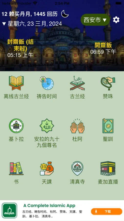 - 显示穆斯林祈祷时间:塔哈朱德、晨禮、日出、晌禮、晡禮、日落、昏禮、宵禮、杜哈、開齋飯 和 封齋飯。