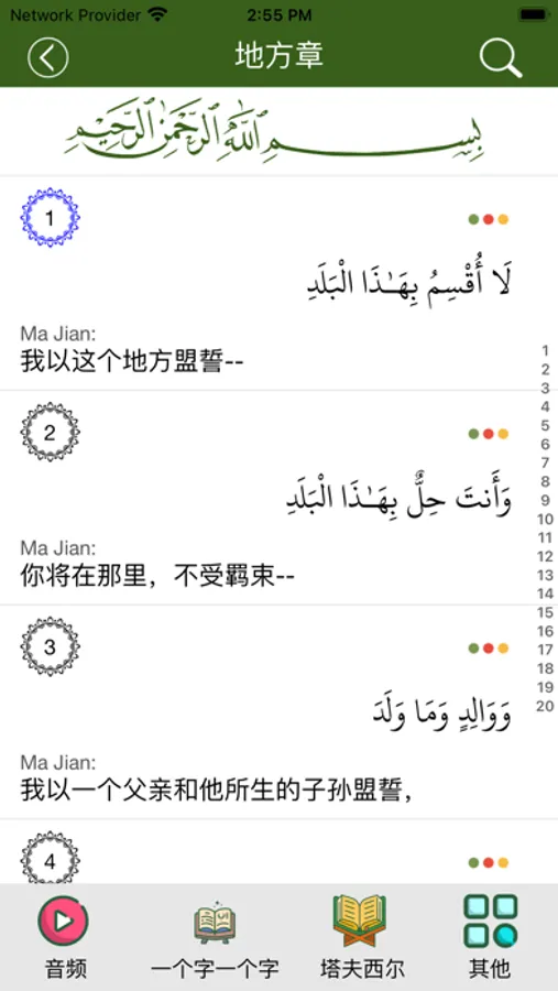 - 与至少 15 名古兰经朗诵者一起聆听阿拉伯语音频中的《古兰经》。