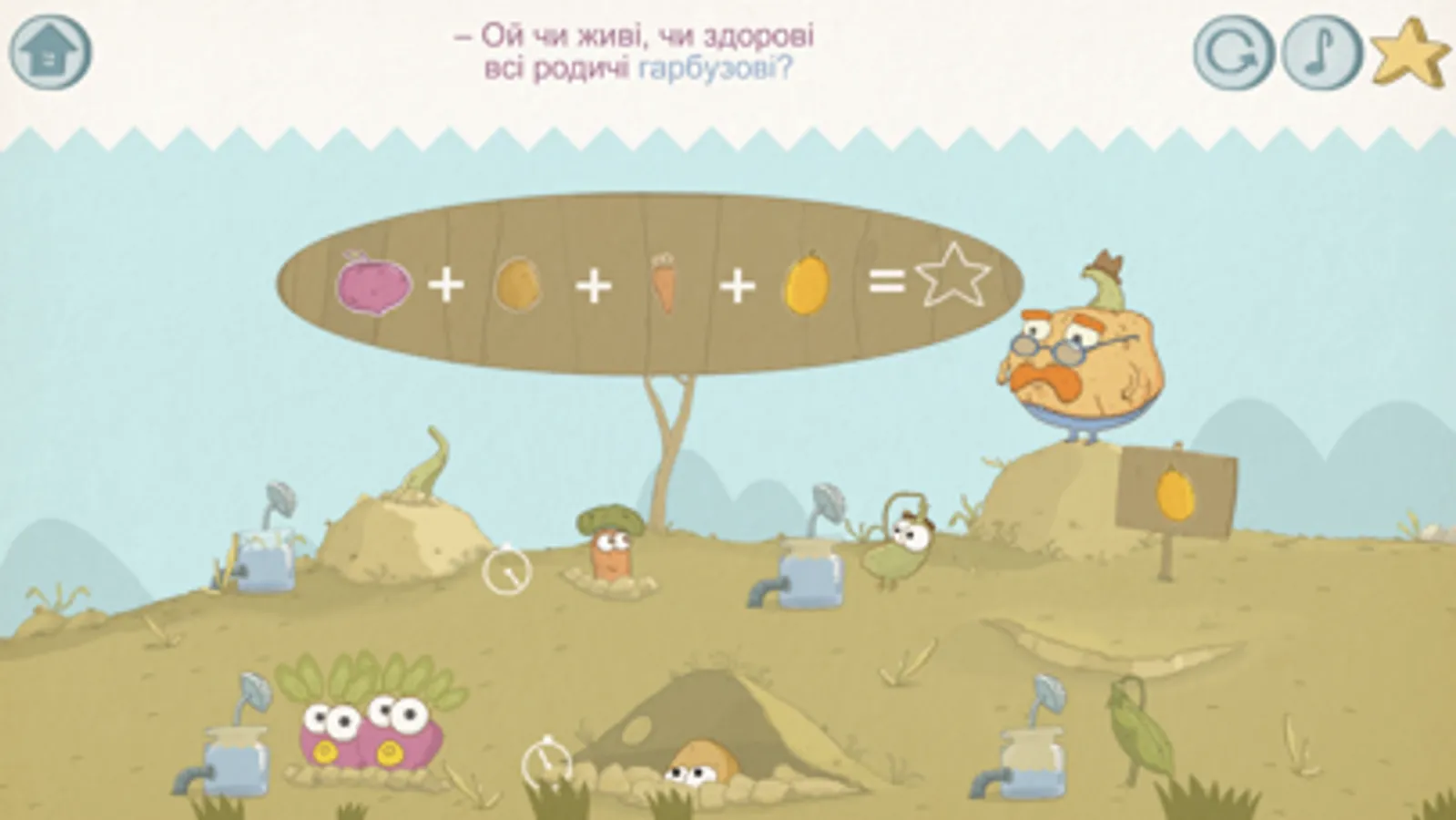 ● Можливість заслужити додаткових героїв у пісні про Гарбуза, вирощуючи правильні набори овочів. Наочна демонстрація поступового росту рослин на грядці. Тренування логічного мислення та елементи лічби;