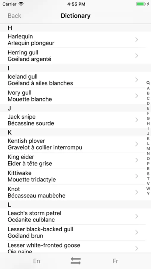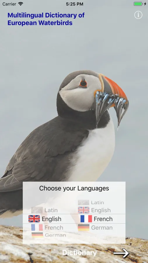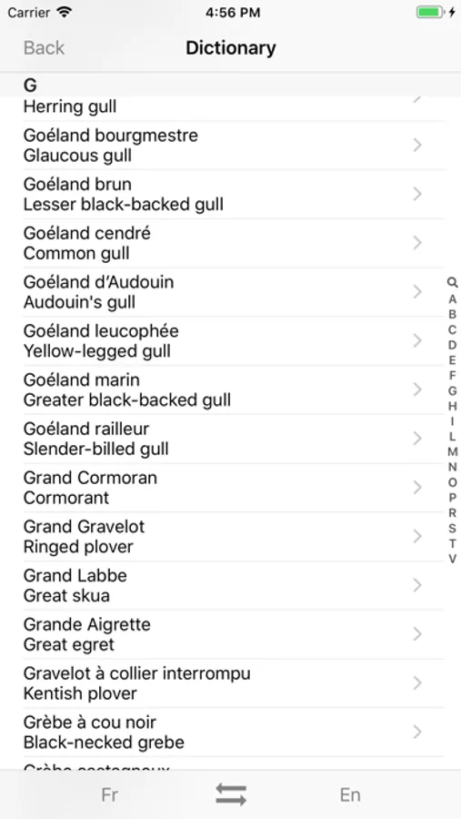 Choose the main language and the translation in the home screen, then touch “Dictionary” to go instantly to the list of all species, alphabetically sorted by the first language.