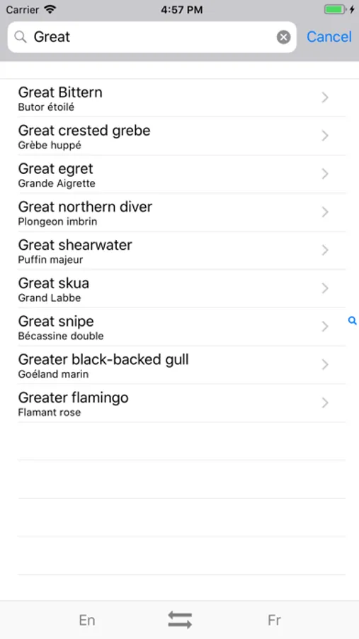 Touch a row to go to a screen displaying a picture of the bird and its name in all the available languages : Latin, English, French and German.