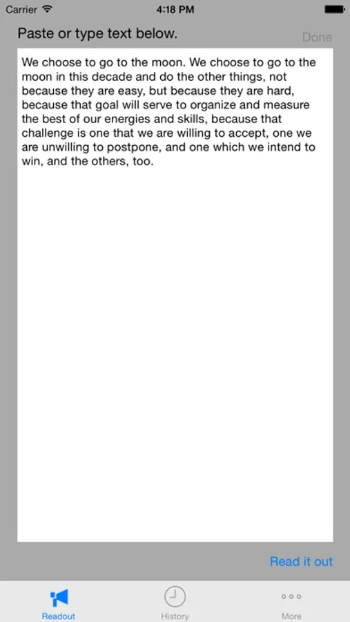 Readout reads out scripts which you type or paste to the text area. The speed and the dialect are configurable. Scripts will be stored and be able to reuse later.