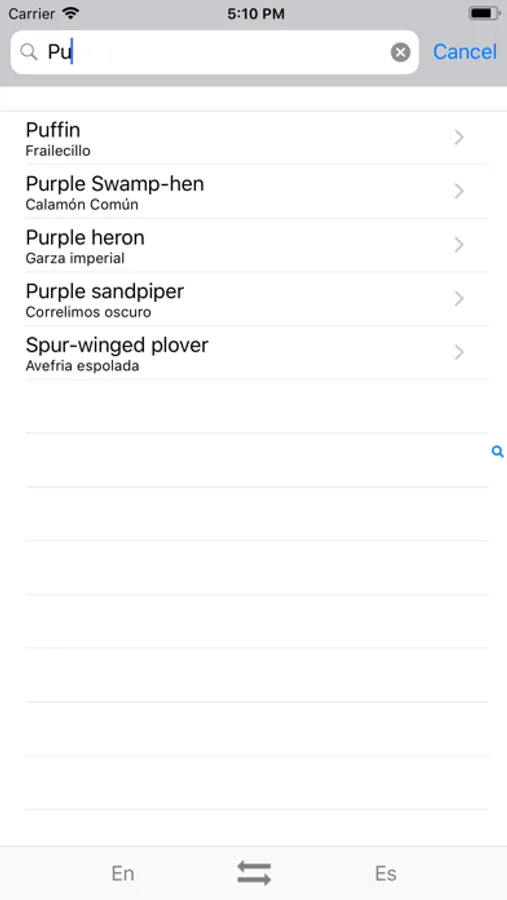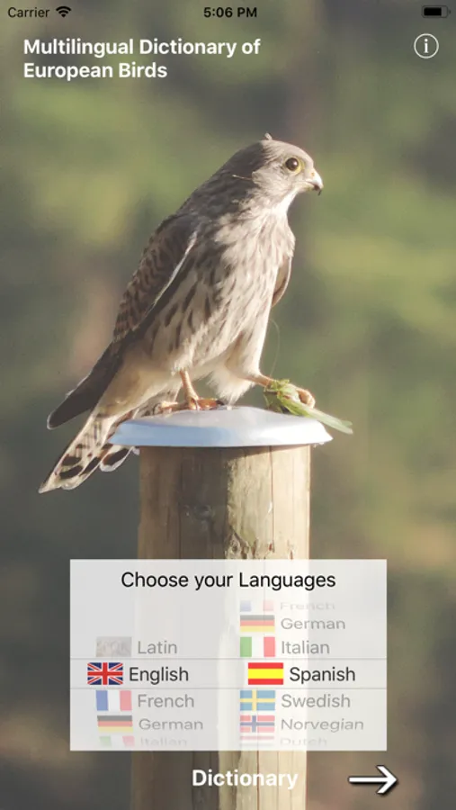 Choose the main language and the translation in the home screen, then touch “Dictionary” to go instantly to the list of all species, alphabetically sorted by the first language.