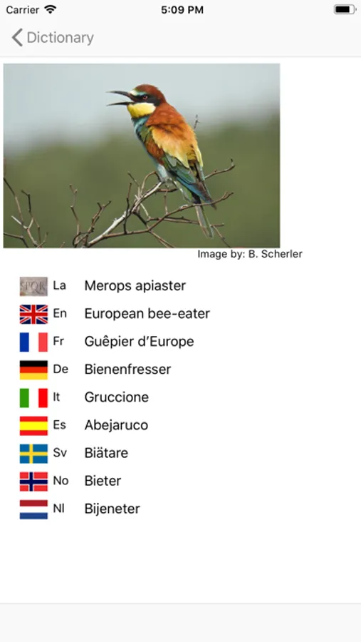 Touch a bird to go to a screen displaying a picture and its name in all the available languages.
