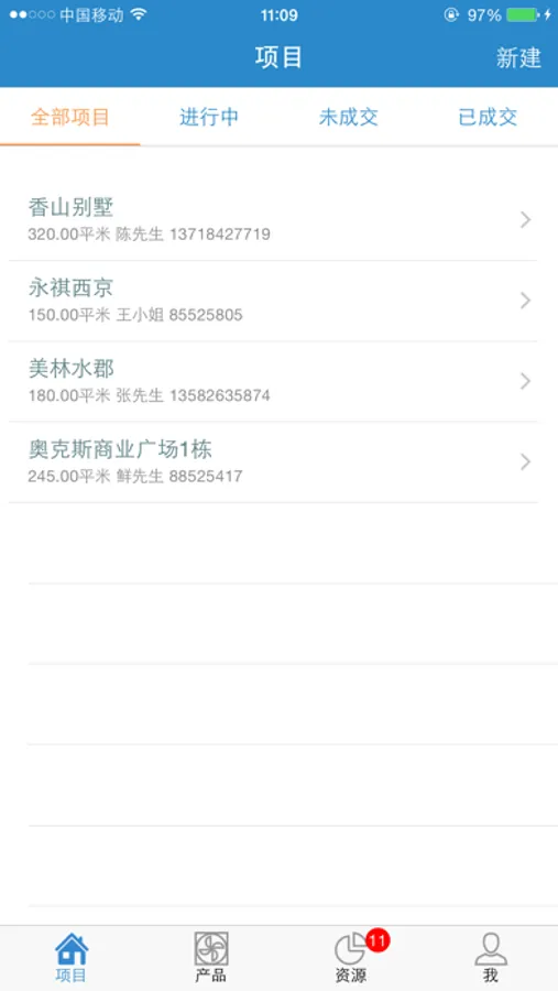 按照项目状态分类,项目状态分进行中、未成交、已成交,可统计项目数据。