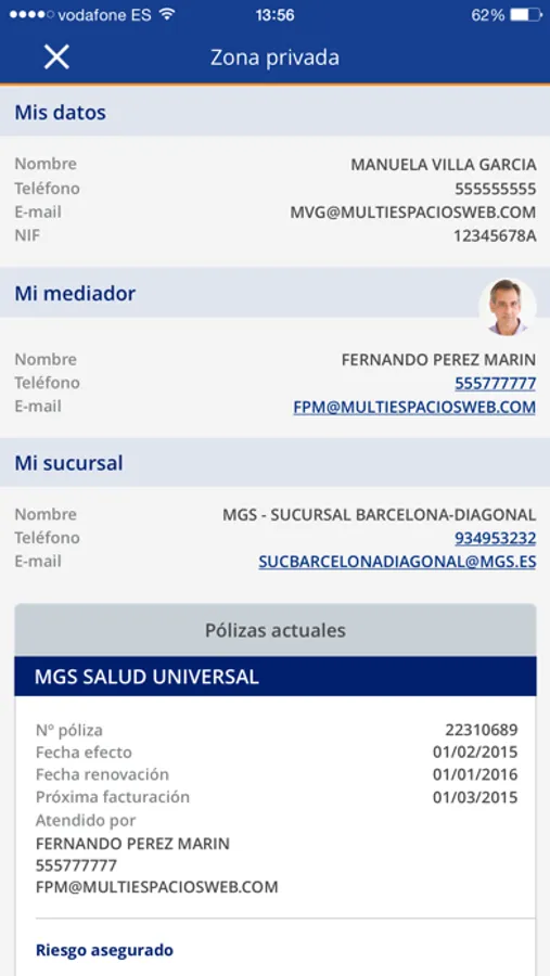 - Zona Privada para clientes donde verás los datos de tu mediador, tu sucursal, las pólizas que tengas en vigor y los siniestros que tengas en proceso. Podrás también modificar la cuenta de domiciliación bancaria