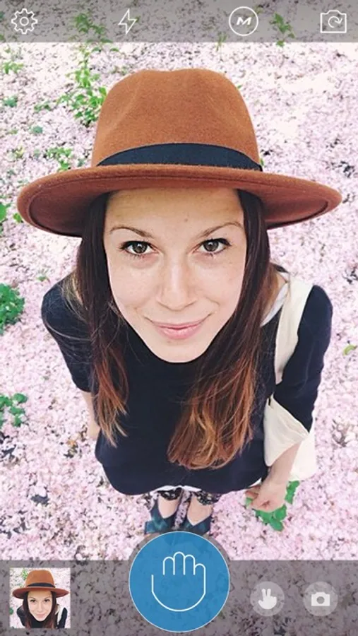 Raise your hand - make sure it's visible on the screen - when you get a blue sign, close your hand to trigger the camera
