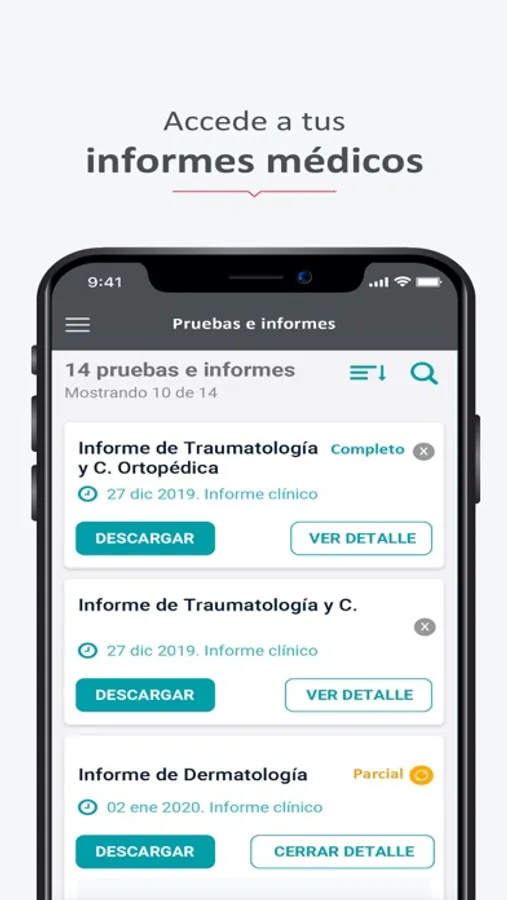 - Consultar sus informes clínicos e históricos de formularios realizados pudiendo filtrarlos por fecha o especialidad.