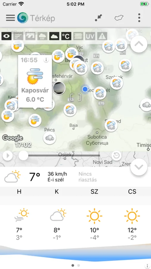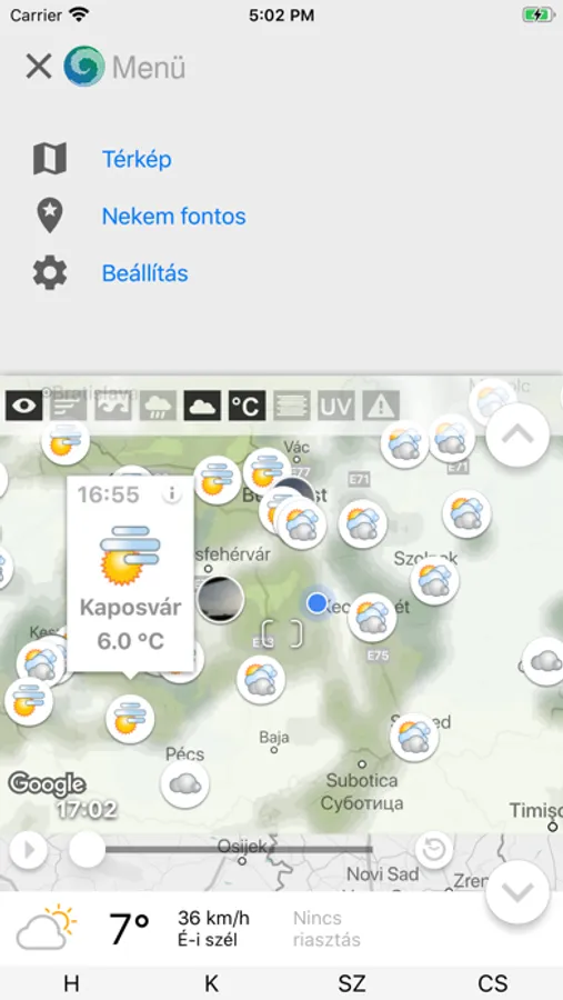 The map view features weather overlays for Hungary that can be animated and combined over the map.