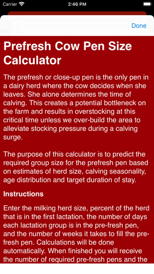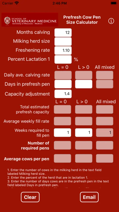 Enter the milking herd size, percent of the herd that is in the first lactation, the number of days each lactation group is in the pre-fresh pen, and the number of weeks it takes to fill the pre-fresh pen. Calculations will be done automatically. When finished you will receive the number of required pre-fresh pens and the average number of cows in the pens. You may email the results as a pdf by touching the email button. You may clear all data to begin another calculation by touching the Clear button.