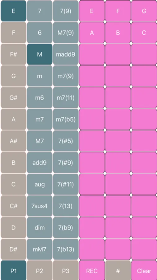 M / m / 6/7 / m6 / m7 / M7 / add9 / aug / 7sus4 / dim / mM7 /