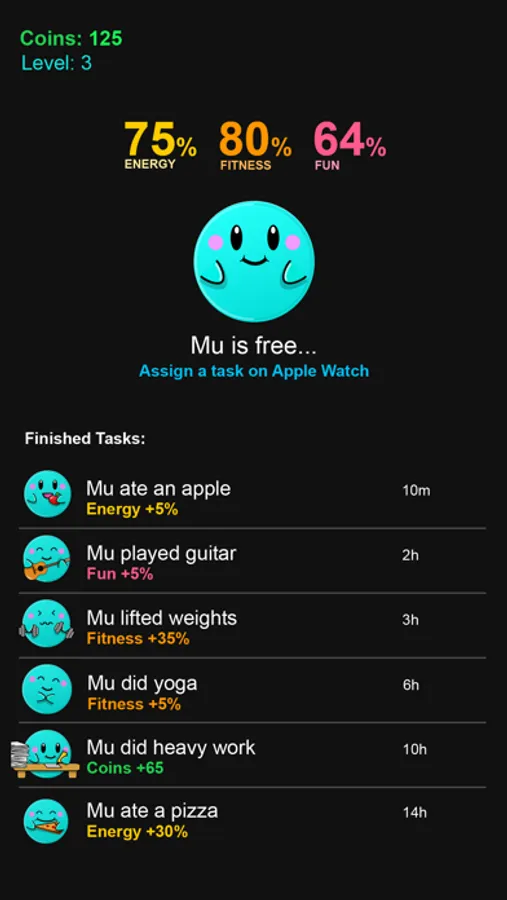 Mu is an adorable blob that lives in your Apple Watch. Level up your Mu by feeding it different foods, choosing the right exercises, and picking the right activities to have fun. Make sure to gain coins to spend on these activities by sending your Mu to work!