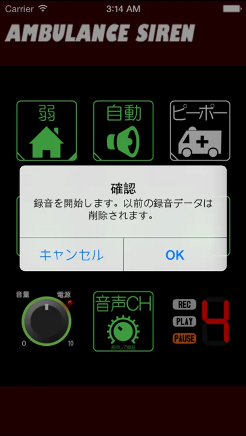 数字が4の時、音声CHボタンをロングタップすると録音確認メッセージが表示されるので、OKをタップすると録音を開始します。