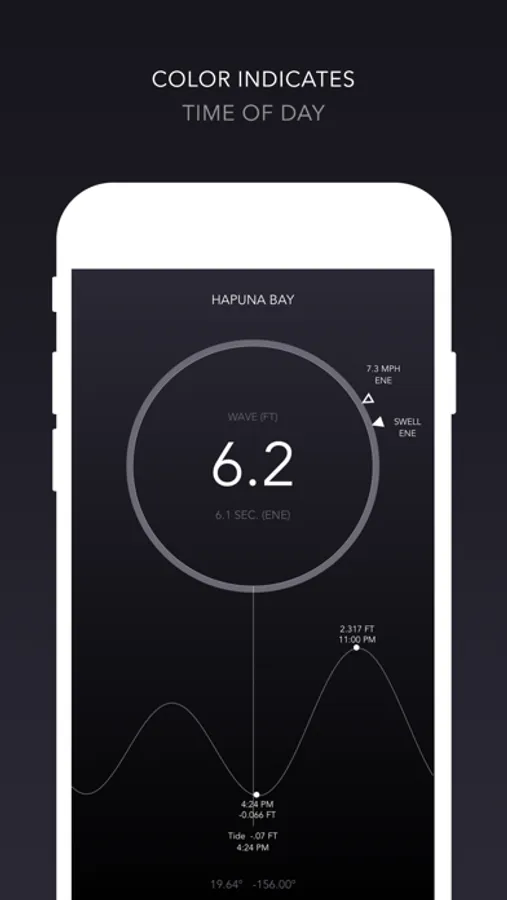 The colors of the app are dynamic based upon the time of day, and the current tide’s rise and fall are represented in an s-curve graph. Wind direction is indicated with a convenient compass feature.