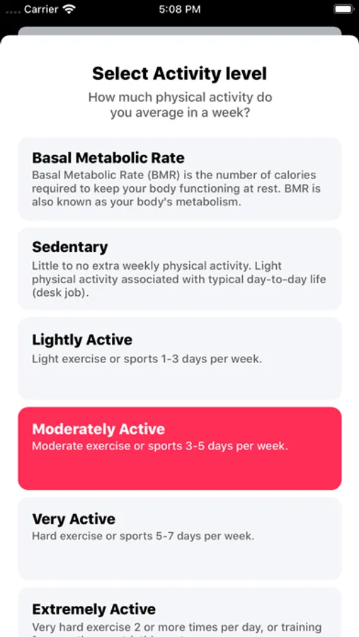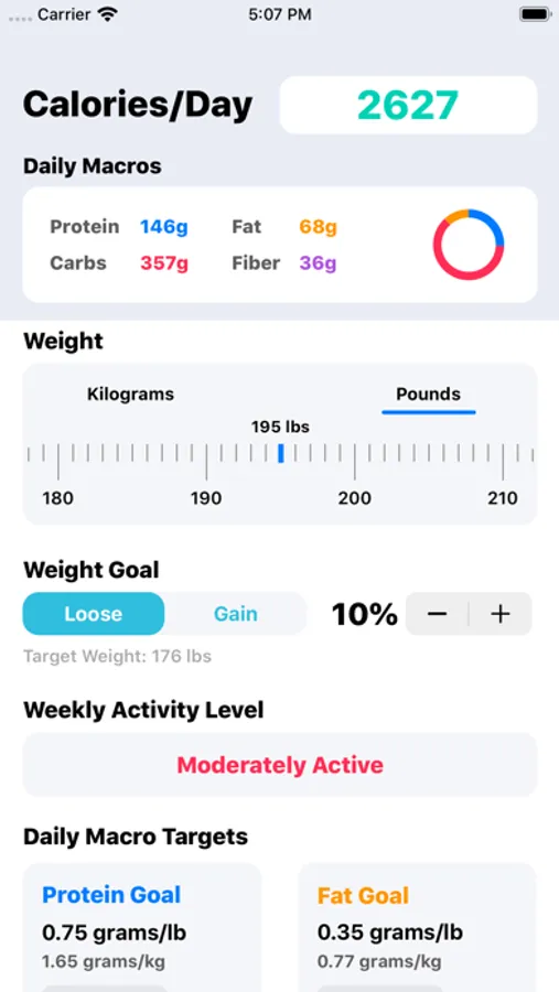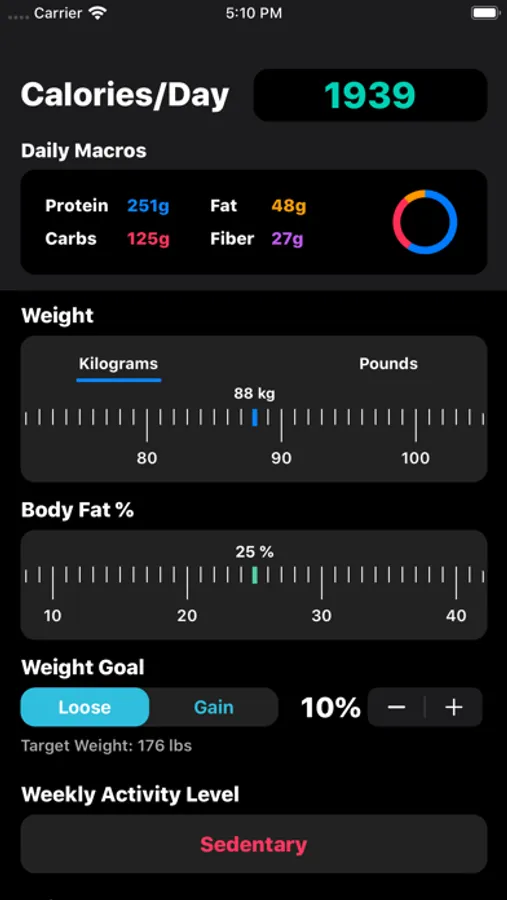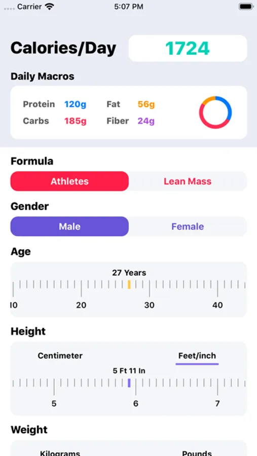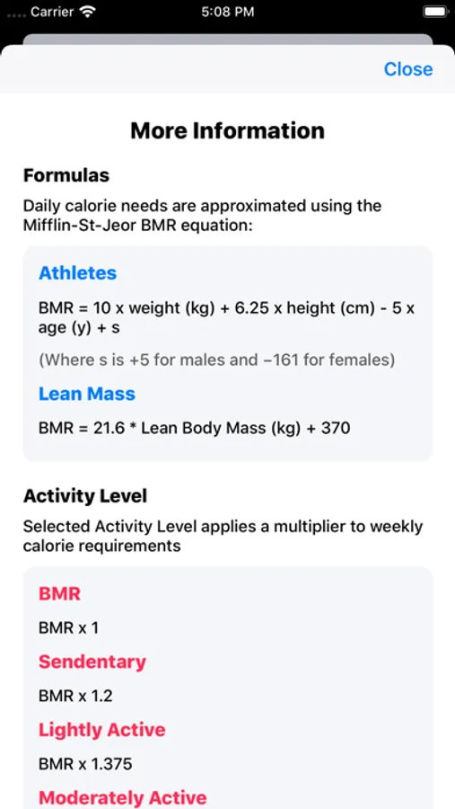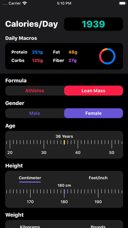 This app uses variations of the proven Mifflin-St-Jeor BMR equation to estimate daily caloric intake as well as optimum protein, fat, carbohydrates, and fiber.