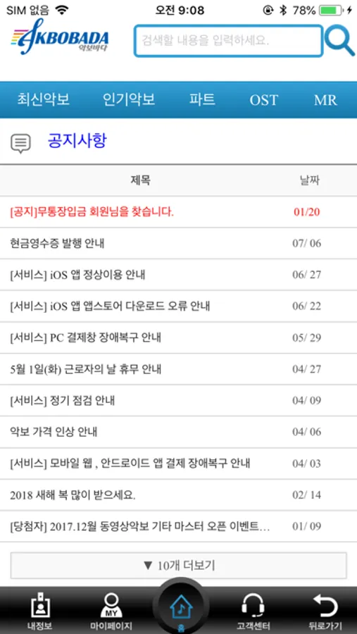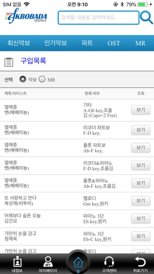 ▶ 최신악보, 인기악보, 파트, OST, MR 및 검색 기능을 이용하실 수 있습니다.