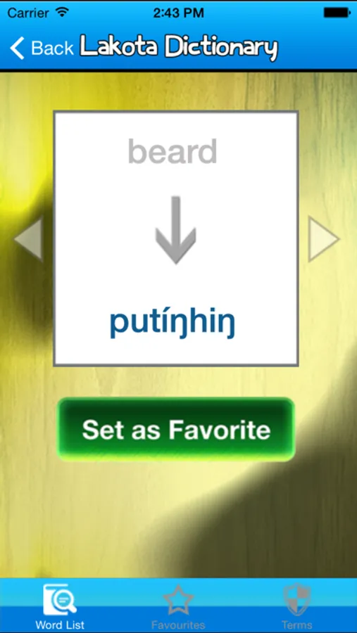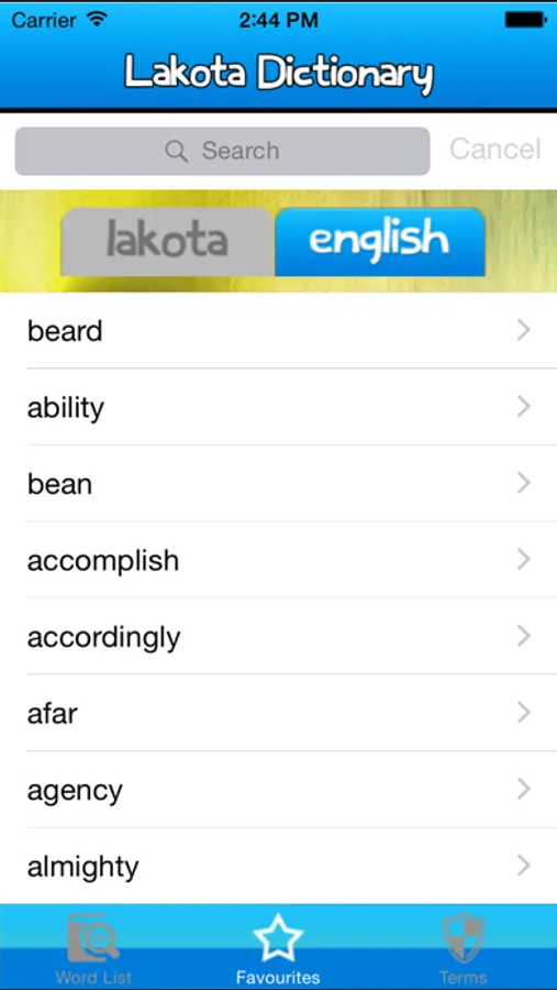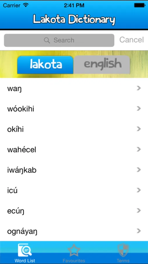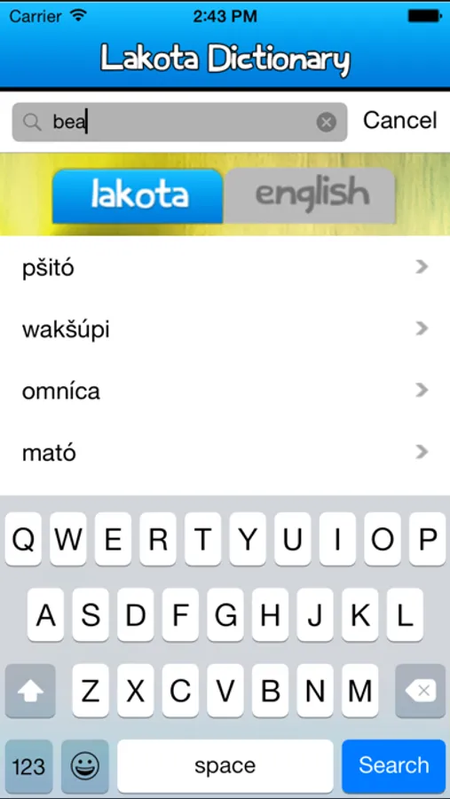 Wordlicious is a very simple and easy to use dictionary. The dictionary is capable of displaying English in simple font and have a database of around 3000 words. The app accepts english and Lakota words using the native keyboard for English respectively.