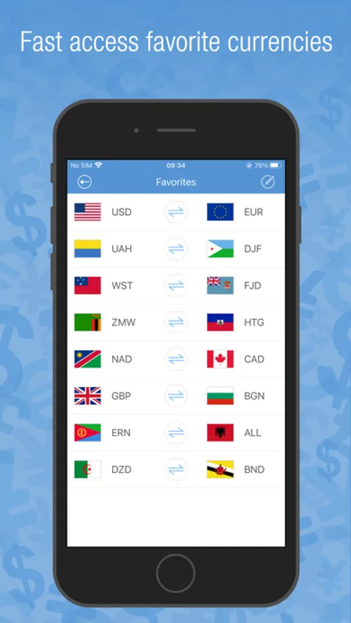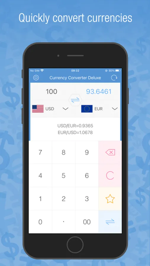 Just choose the currencies to convert and tap on the amount to convert. You can add the used most often currency pairs to Favorite for fast access.