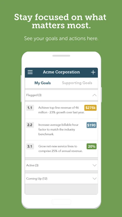Have a clear vision of your organization’s strategic direction by putting your strategic plan in your pocket. With your own personal dashboard, you can manage your goal’s performance in seconds while seeing what’s active, what’s coming up, and what needs attention. Full-feature goal setting allows you to collaborate with your team to add, modify, and monitor supporting actions on the fly. Your business life matters. Make it count.