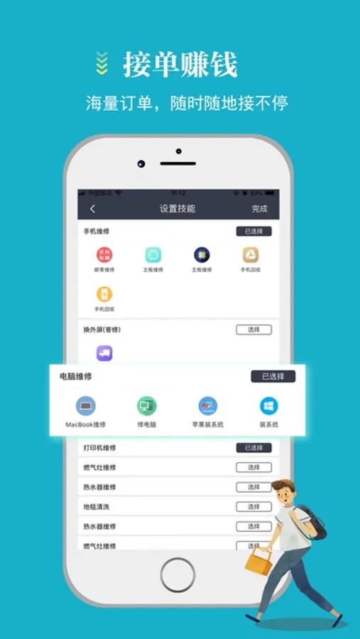 精准线索:根据技能匹配相应的服务线索,一键抢单,直接跟用户沟通达成交易。