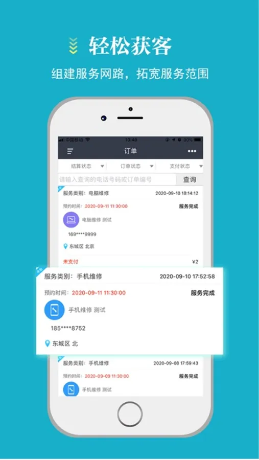 蓄客多打造一站式商家接单、获客、用户管理服务平台。利用信息技术助力商家组建服务网络,拓宽服务范围,轻松获客,海量订单接不停。并为商户提供高质量的客户管理服务功能,是商户实现接单需求的必备工具,提高商户和客户之间的沟通频率,提高接单和服务效率。