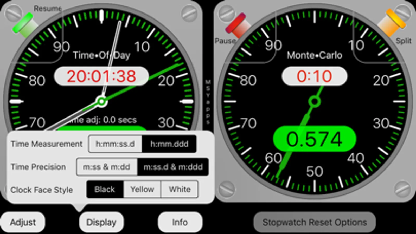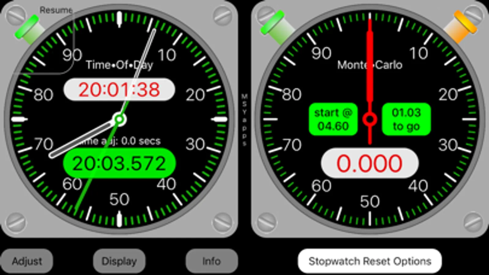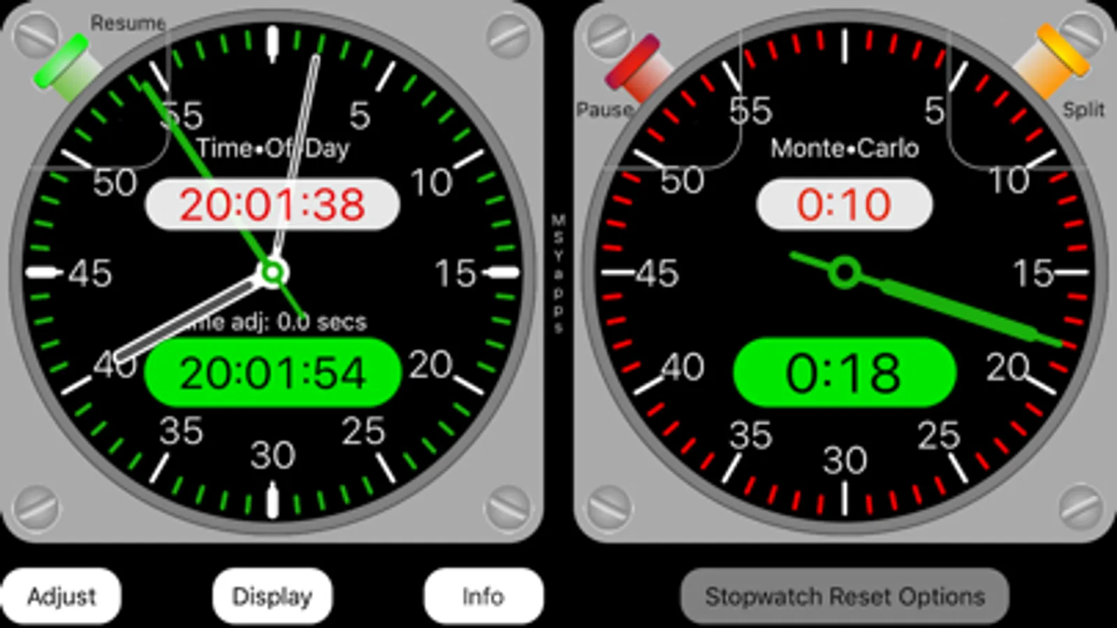 Monte•Carlo on the right is a stopwatch with two buttons: one starts and resumes the stopwatch and the other records each lap.