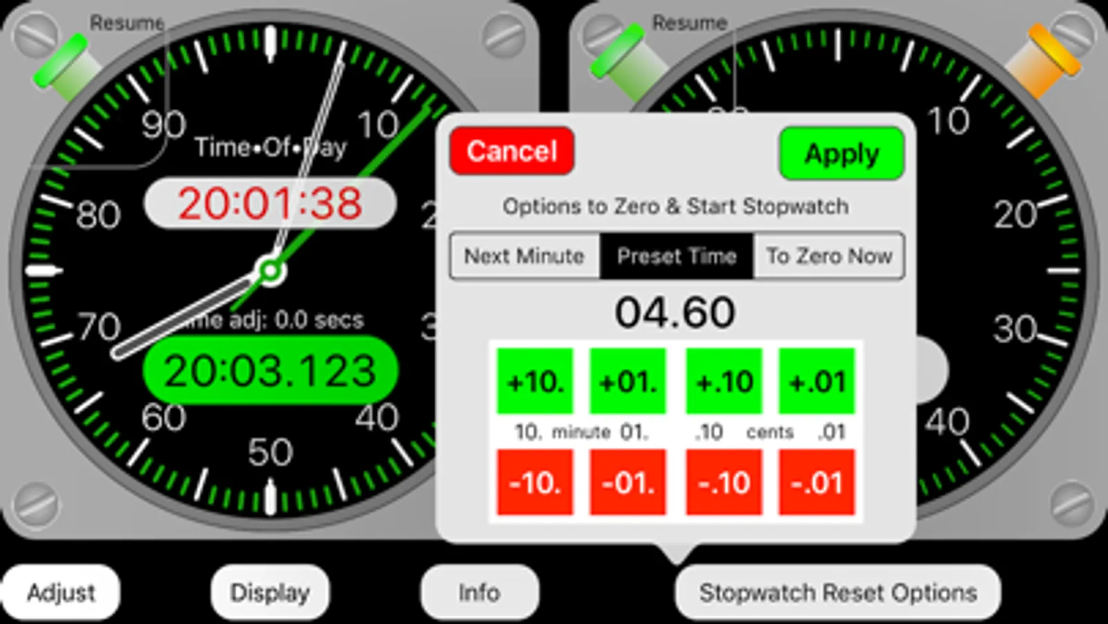 When the stopwatch has been stopped, there are three options for resetting it to zero for another start available when you click the Stopwatch Reset Options button below the stopwatch. One option (To Zero Now) is to reset to zero and await pressing the Start button. A second option (Next Minute) is to have the stopwatch reset when the time-of-day clock reaches the next full minute. A third option (Preset Time) allows you to select any time in either minutes:seconds or minutes:cents using the four sets of green or red buttons to increment to the time desired.