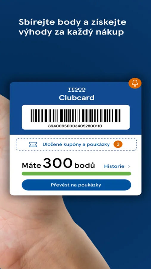 With all purchases, you earn points (1 for every 10 CZK) that are credited to your Clubcard account. Once you have earned at least 300 points, you can transfer it to a voucher, which you can redeem the next time you shop. You can track changes to your points in your Clubcard account.