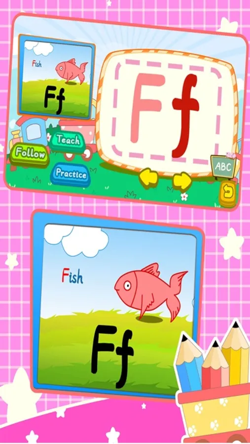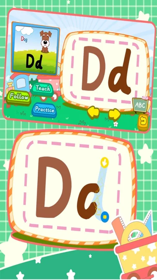 Secondly, the following mode will provide some guides for the kids to starting writing the letters. This give a chance for the kids practices writing the letters and also reinforce the recognition for the letters. This functions will be great and helpful for those kids who just start learning english alphabet.