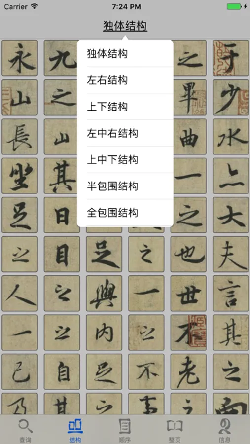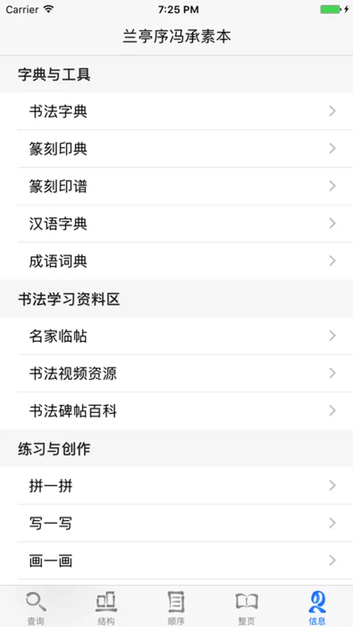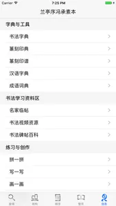 11,信息页提供书法字典、篆刻印谱、印典、汉语字典、成语字典;碑帖百科、书法视频、经典临帖;拼一拼、写一写、画一画、离线单字临帖、离线整页学习等等功能。