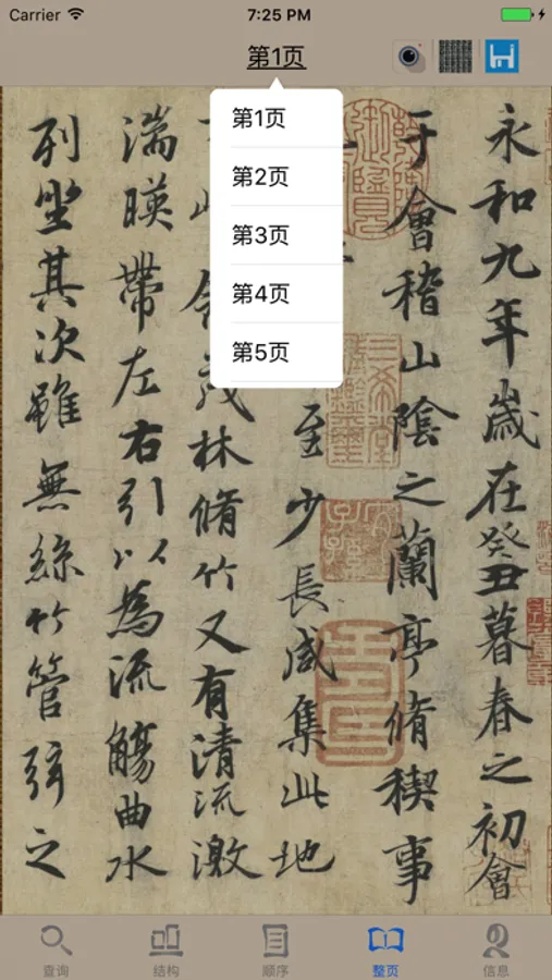 本应用程序为一个可以手写练习王羲之《兰亭序》的应用,也为书法学习者提供一个便捷的单字字帖。不仅可以方便检索,还可以解放书桌空间。打开的单字大图索引等都在本地有缓存,省却没有网络无法学习的烦恼。