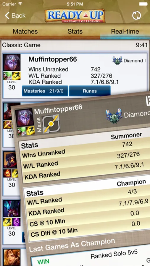 • REAL-TIME STATS – Quickly find out your opponent’s Tier, Division, Masteries and Runes, then dive deep into their W/L record and previous games as each champion.