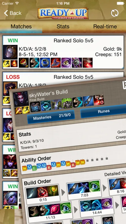 • IN-DEPTH MATCH HISTORY – A lot of apps give you match history, but we didn’t stop at a simple overview. We let you see the order of abilities and items that helped your favorite summoner achieve victorious routing of the opposing team. You can even save their best builds to guide you!
