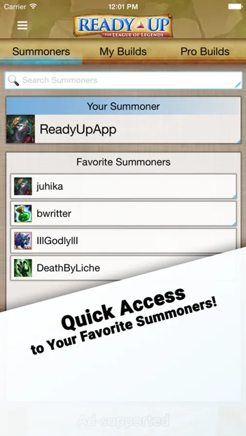 Fast and effective, LoL Ready Up is the best real-time companion app for League of Legends! Appraise your teammates and opponents at a glance, even before the game. Study a summoner's history, down to their individual champions. Return to your previous games and save your best builds for use in future matches. (Or download builds from the pros, updated daily!) Comes with a complete codex of items, abilities, terminology and lore.