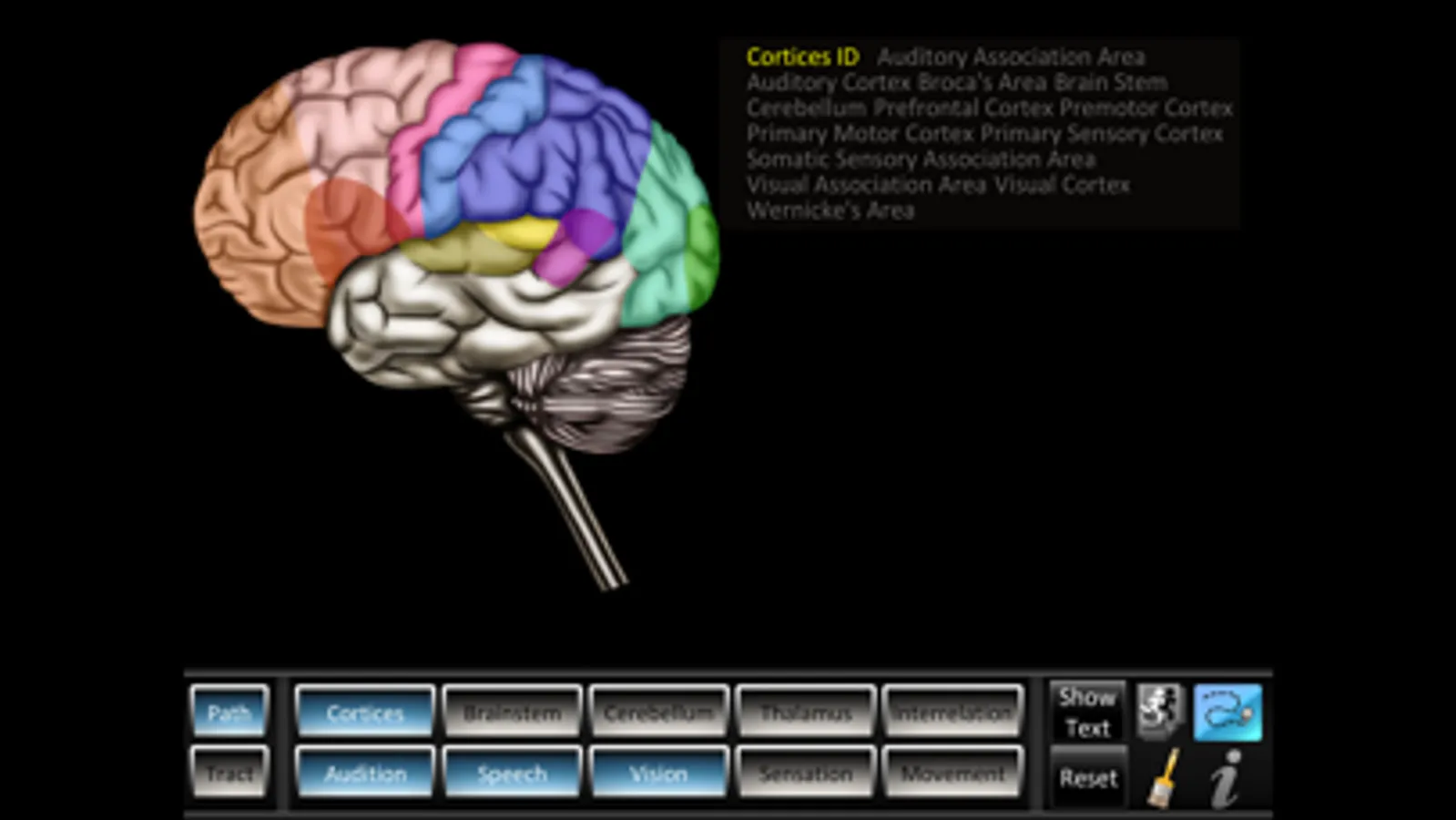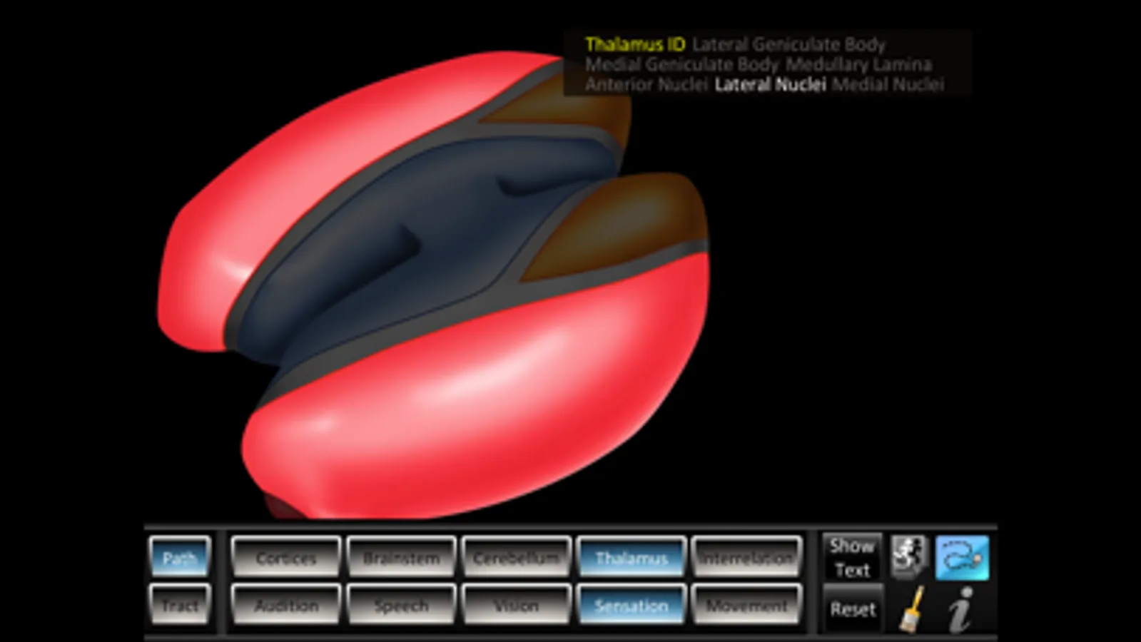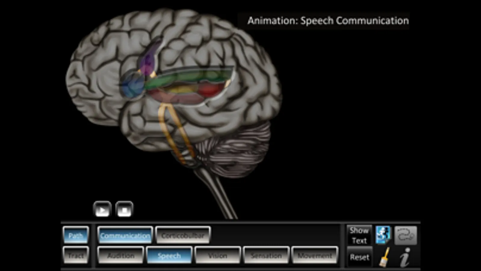 Pathway: structure ID - cortices, brainstem, cerebellum, thalamus and thalamus interrelation views. Animations - audition listen and balance, speech communication and corticobulbar, vision,sensation and movement views..