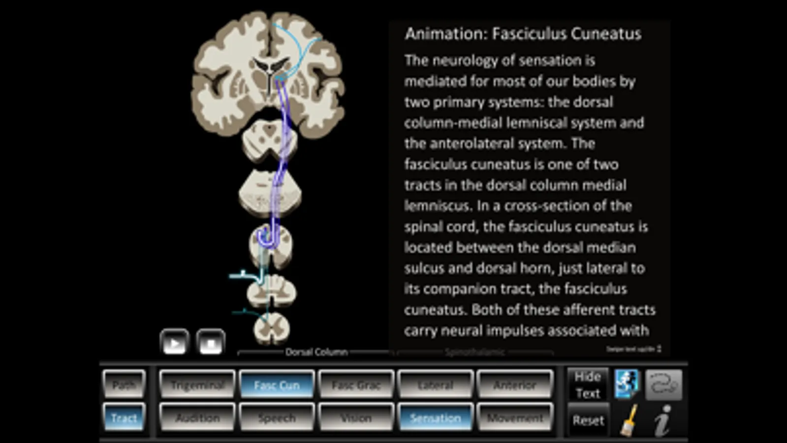Tracts: structure ID - audition listen and balance, speech communication and corticobulbar, vision, sensation trigeminal, dorsal column and spinothalamic, movement rubrospinal, reticulopinal, tectospinal and corticospinal views. Animations - audition environment, speech and balance, speech communication and corticobulbar, vision, sensation trigeminal, fasciculus cuneatus, fasciculus gracilis, spinothalamic lateral and anterior, movement rubrospinal, reticulospinal, tectospinal, corticospinal lateral and ventral views.