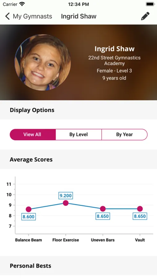 • View and interact with charts for average scores, personal bests, and previous event scores