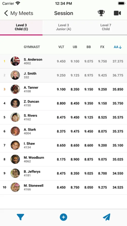 • Send text messages from the scoring screen so others can see how your gymnast did