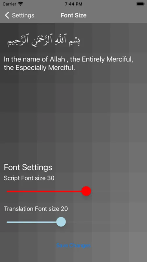 • Adjustable font size for both Arabic script and translation.