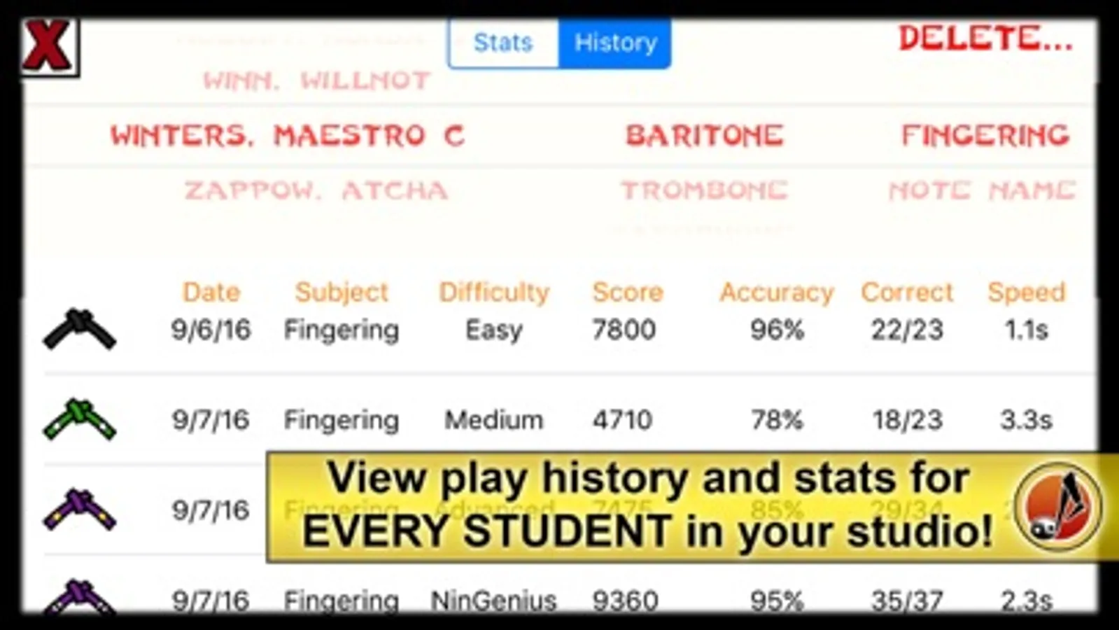 Your students will work like never before to master their note names and fingerings under the pressure of frenzied music and a timer moving closer to zero! They will want to play over and over to make it to the top of the HIGH SCORES LIST, increasing their speed and accuracy as they earn a collection of ninja belts. NinGenius keeps a record of every game played, allowing you to view complete stats for each student in your studio. You can also EMAIL YOURSELF a CVS file containing all gameplay data so you can analyze student progress and sort by any field.