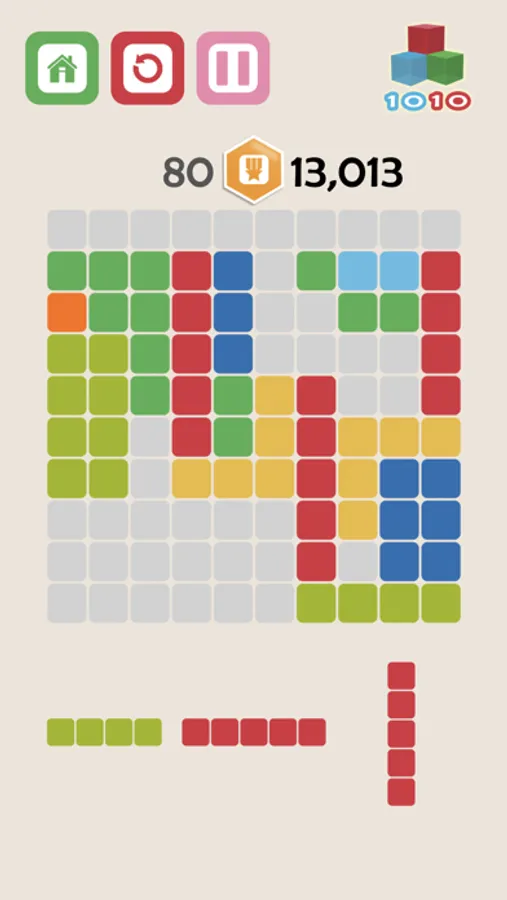 Drag and drop the blocks into the board, then clear the blocks by making a line of full bricks horizontally or vertically.