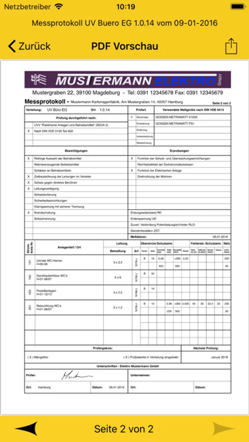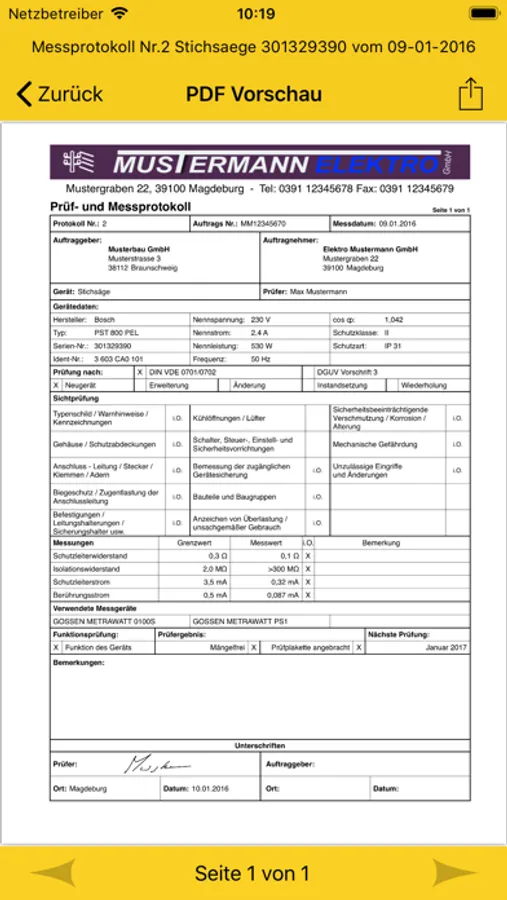 Über die Export-Funktion können Messprotokolle als *.XML exportiert und auf einem anderen Gerät mit der Messprotokoll-App importiert werden. Dabei werden die Verteilung/ das Gerät sowie Baustelle/Auftraggeber und die Firma mit übernommen. Die Daten in der XML-Datei sind verschlüsselt und können nur über die App ausgelesen werden.