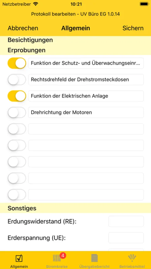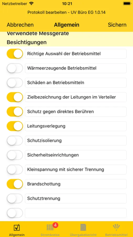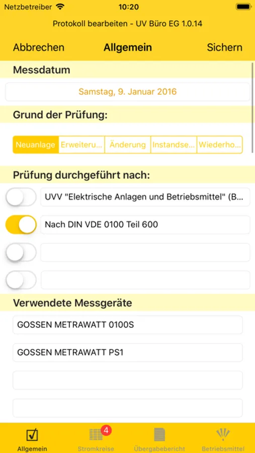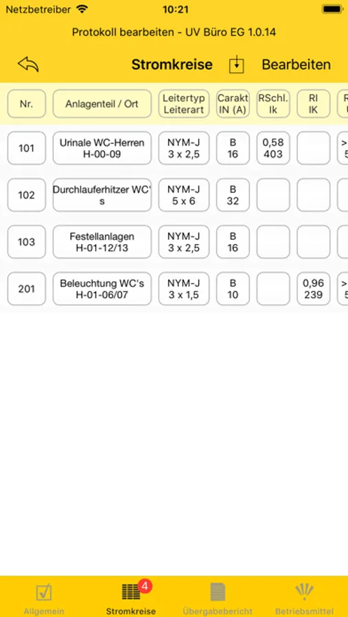 Es können in einem neuen Messprotokoll Stromkreise aus bereits erstellten Messprotokollen übernommen werden was bei häufig wieder kehrenden Stromkreisen erheblichen Eingabeaufwand vermindert. Unter Einstellungen kann man Auswählen welche Daten aus den bereits erstellten Stromkreisen übernommen werden und im Tabellenkopf ist ersichtlich welche Einstellungen vorgenommen wurden.