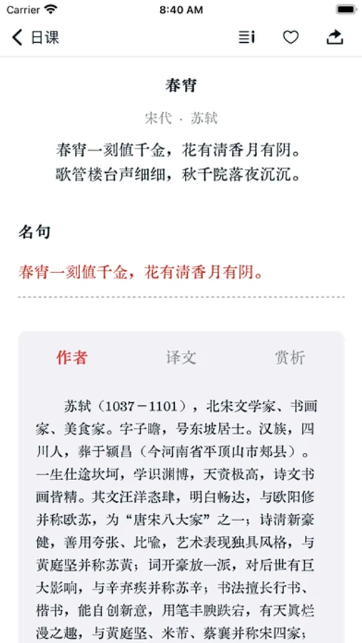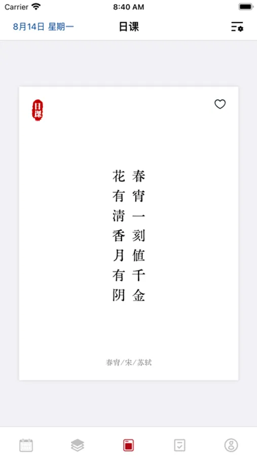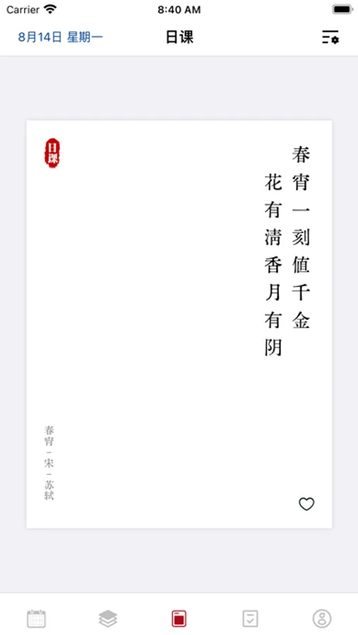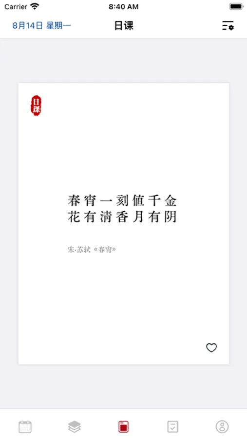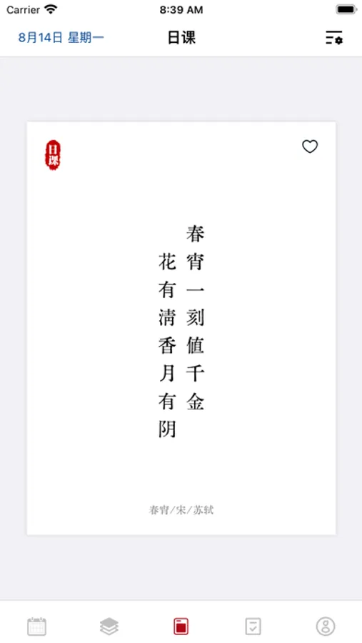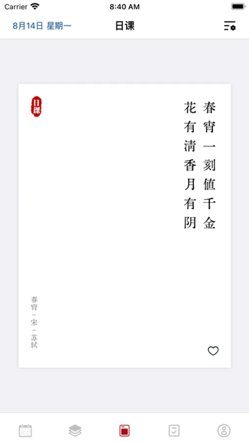 日课,顾名思义:每日一课。它通过每日推荐三首古诗词中经典名句的形式来呈现中国传统诗词,是给那些喜好古诗词,内心深处对古诗词充满向往的人准备的 App。