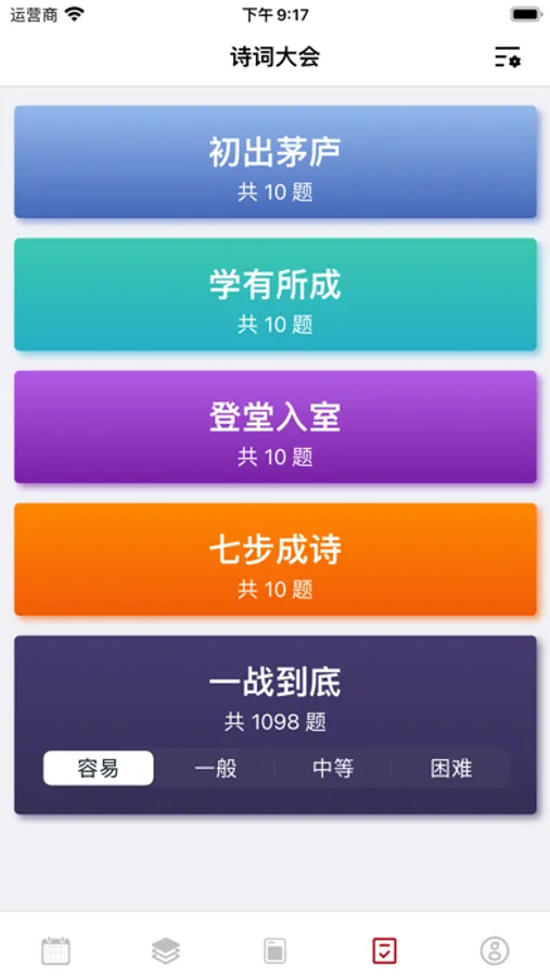2、诗词大会:由易到难分为”初出茅庐“、”学有所成“、”登堂入室“、”七步成诗“四个等级,休闲娱乐中熟记优美的古典名词;更有一战到底模式,让您一次玩个够。