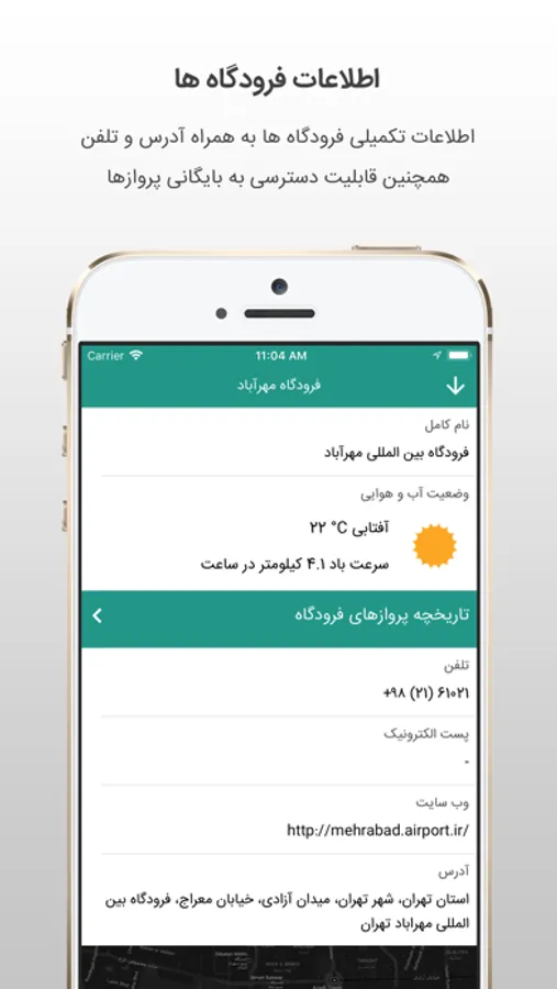 - دسترسی به نقشه فرودگاه ها به همراه آدرس و وضعیت آب و هوایی فرودگاه