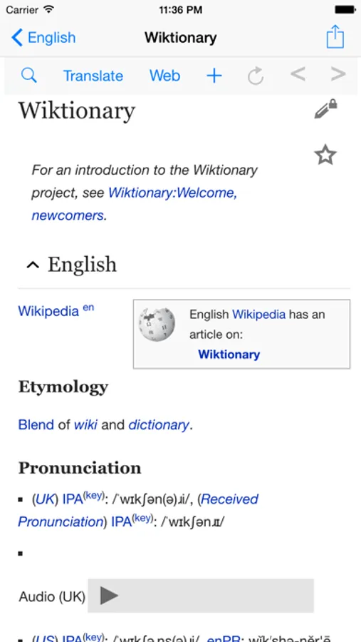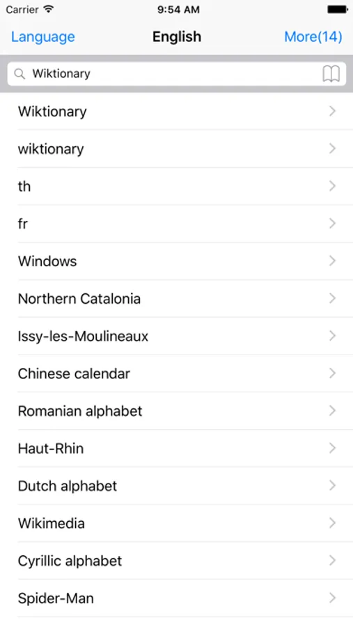 Wiktionary Reader is a viewer app of Wiktionary which is a Web-based multilingual free dictionary. You can perform a full-text search for keywords and the results will be displayed in a list. Tap the [Select Language] button to change the target language. Tap the [Random] button to display a page of items at random. Tap the [Bookmark] button to open the Bookmarks and History page.