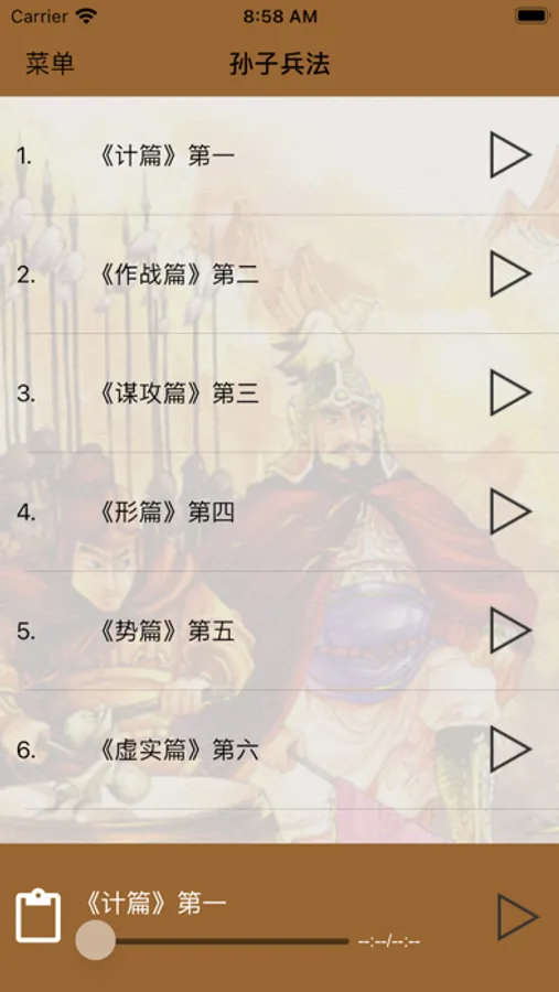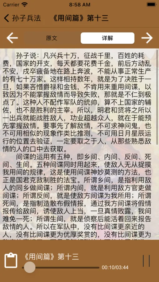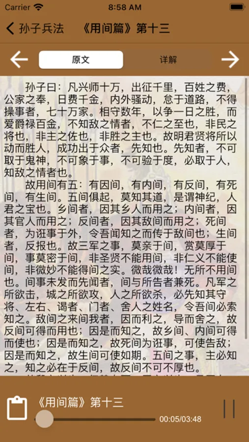 《孙子兵法听读》是专为军事和国学爱好者提供的学习经典,突破书本和光盘载体方式,其中包含孙子兵法真人原文朗读、孙子兵法原文详解,操作简单,可以对孙子兵法原文循环复读,并配有优美的背景音乐,可充分利用碎片时间随时听、读,达到快速强化学习孙子兵法的目的。