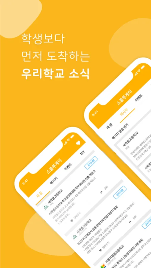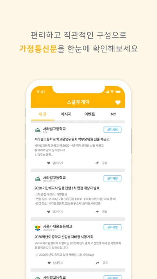 앱으로 바로 전국 1만여 학교의 가정통신문과 공지사항을 확인할 수 있으며, 기억해야 할 포스트는 담아두어 나중에 쉽게 찾아볼 수 있습니다.