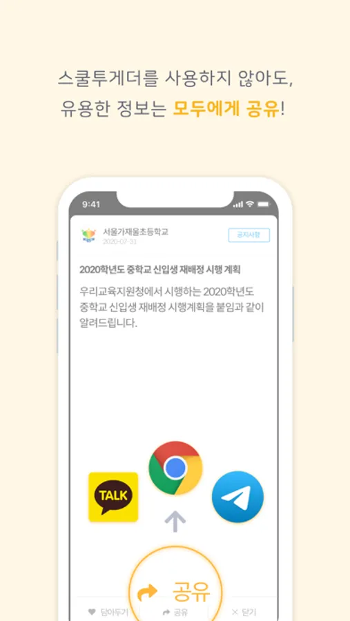 학교에서 보내는 문자메시지, 이제는 스쿨투게더로 받으세요! 중요한 공지 뿐만 아니라 내 아이 소식을 사진까지 생생하게 받아보실 수 있는 단 하나의 앱! 스쿨투게더입니다.